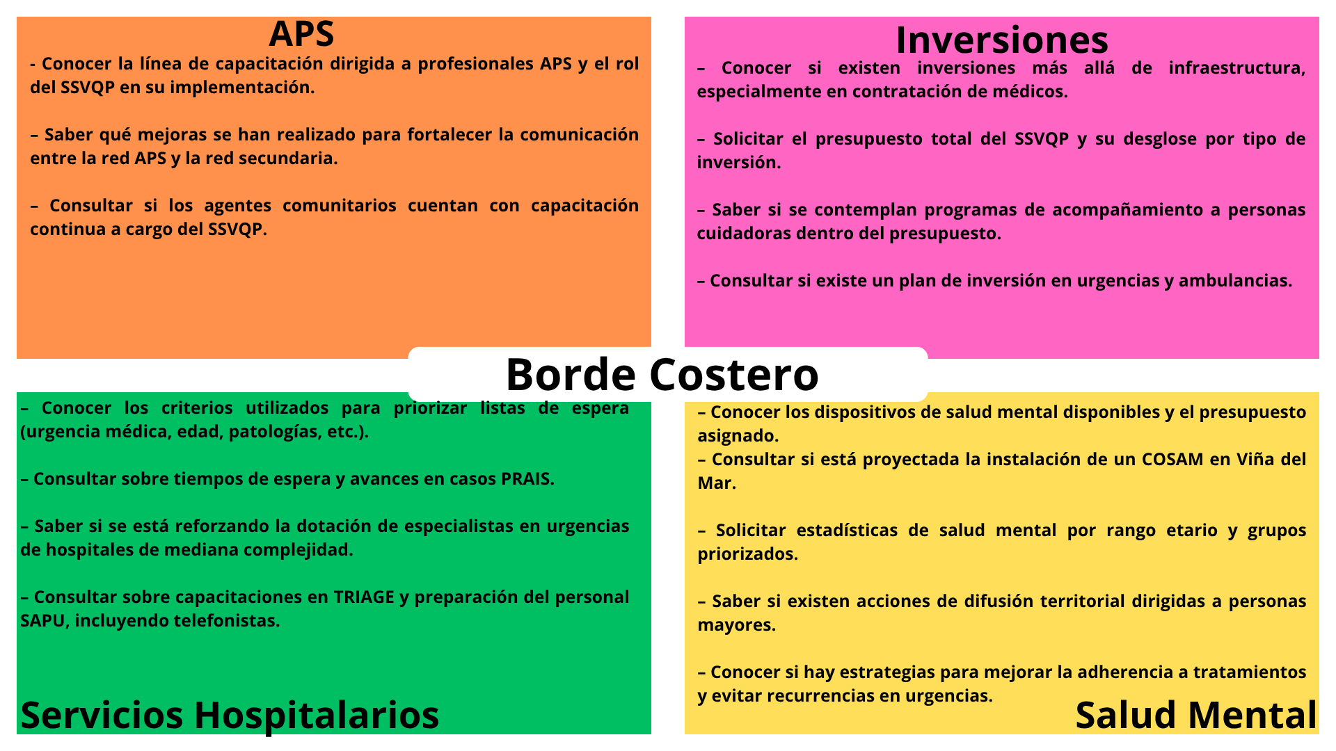 En la oportunidad, y a través de recursos audiovisuales, se dio a conocer la gestión del SSVQP, en materia de avances en atención primaria, atención prehospitalaria, atención secundaria y terciaria, con los logros en los programas del ciclo vital, así como la atención en el área hospitalaria, relacionados con listas de espera, gestión de tiempos de espera, Plan Nacional del Cáncer, farmacia, laboratorio, rehabilitación, también el área de inversiones, finanzas, gestión del cuidado, participación social, acreditación, relaciones laborales, entre las muchas áreas de gestión de esta gran red asistencial.