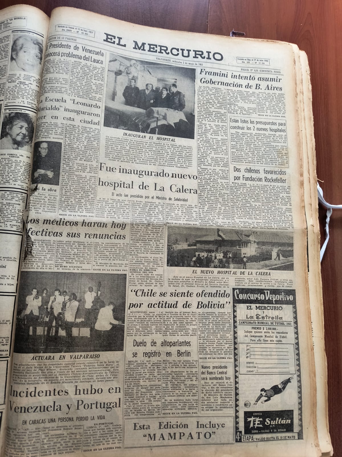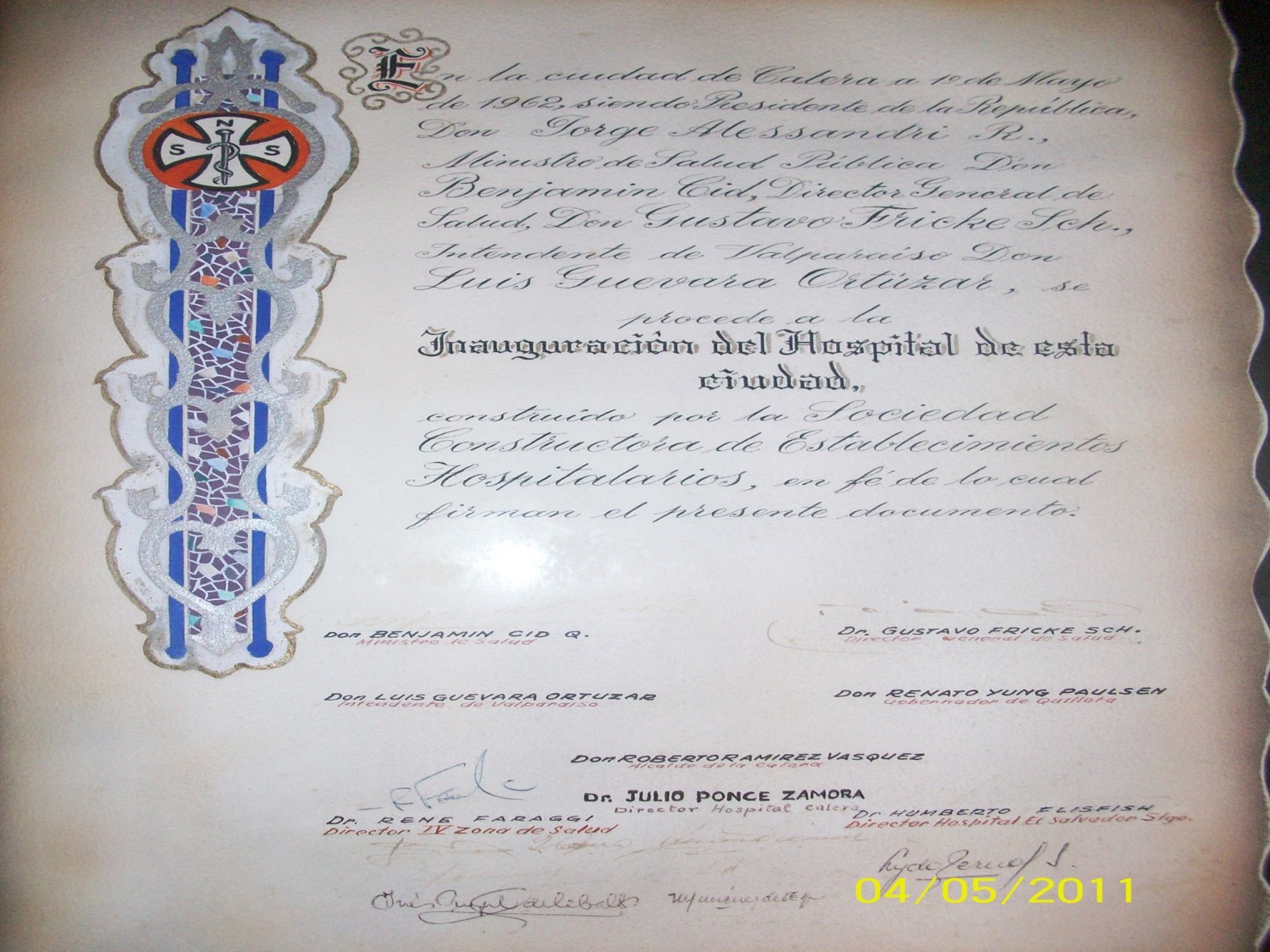 “En la ciudad de La Calera a 1º de Mayo de 1962, siendo Presidente de La República Don Jorge Alessandri, Ministro de Salud Pública: Don Benjamín Cid. Director General de Salud: Gustavo Fricke, Intendente de Valparaíso: Luís Guevara Ortúzar.